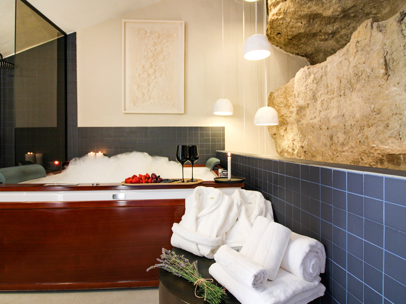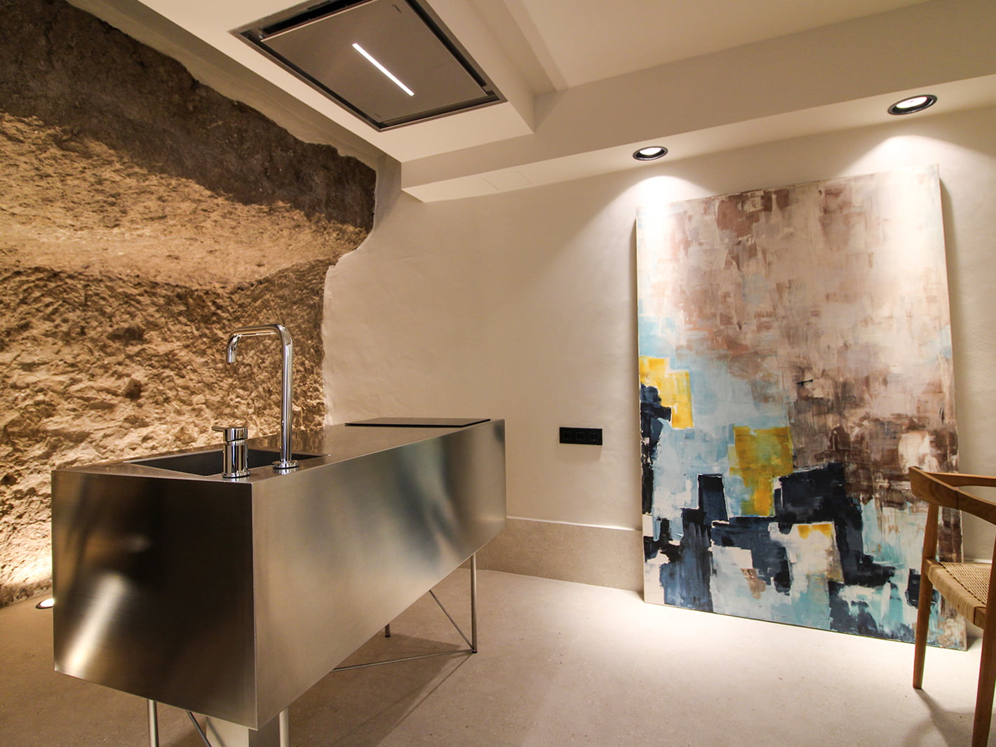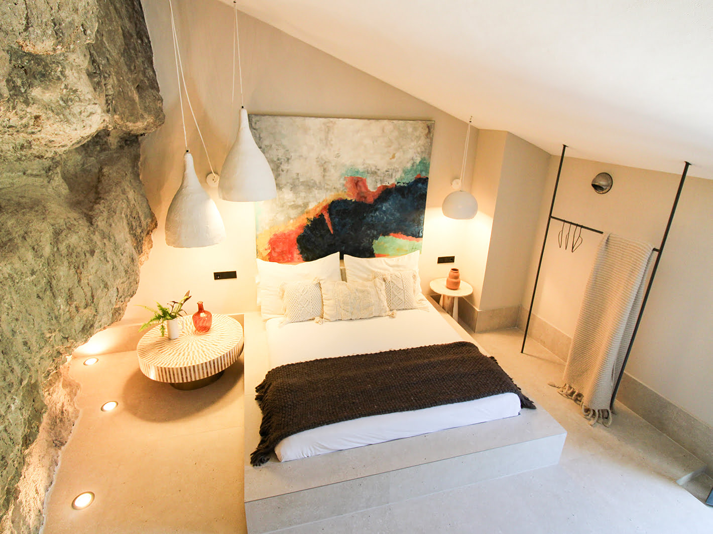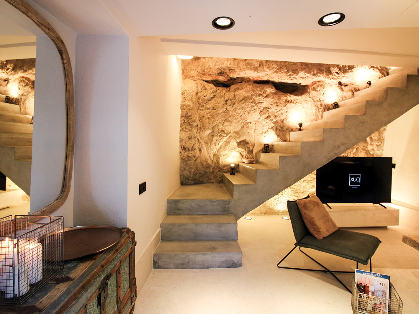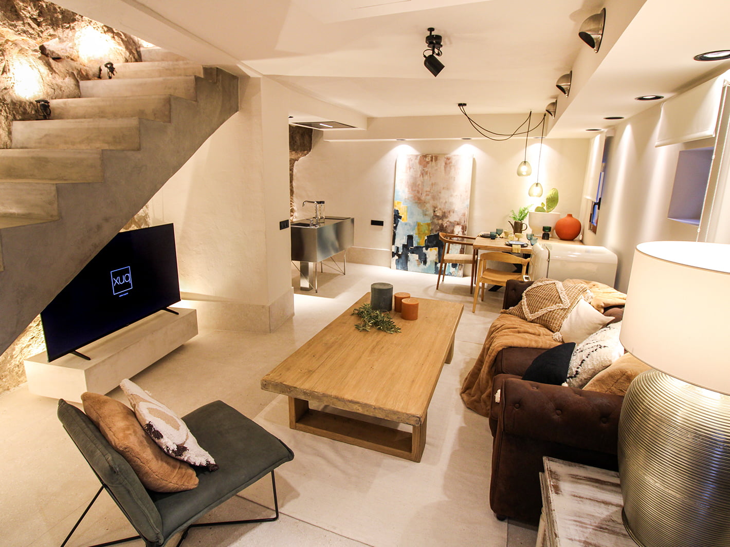 Nuestra mítica Suite COVA. Ha sido rehabilitada íntegramente en 2024, conservando la esencia que le caracterizaba y adaptándola a las nuevas necesidades. Consta de 80 m2, divididos en dos plantas. En la primera se ubica un salón con con una TV de 65 pulgadas, donde se fusiona con una cocina abierta de diseño completamente equipada.