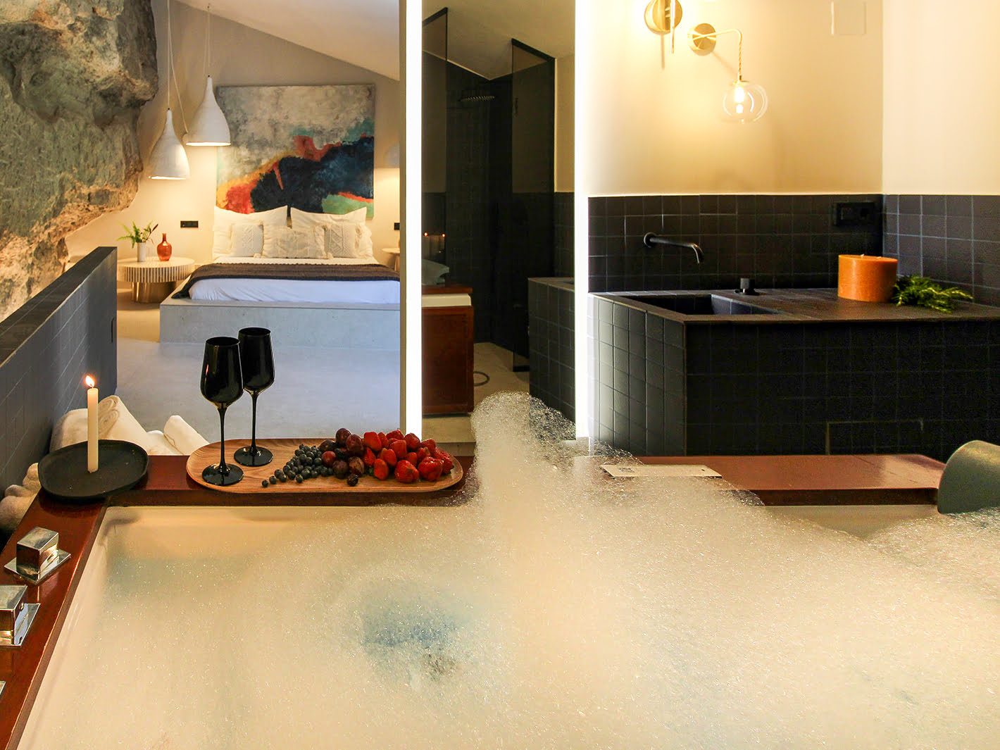 Su amplio dormitorio compone la segunda planta de toda la suite, cuenta con una cama King Size, y una TV de 49 pulgadas, y un impresionante jacuzzi climatizado dentro de la habitación, con cromoterapia.