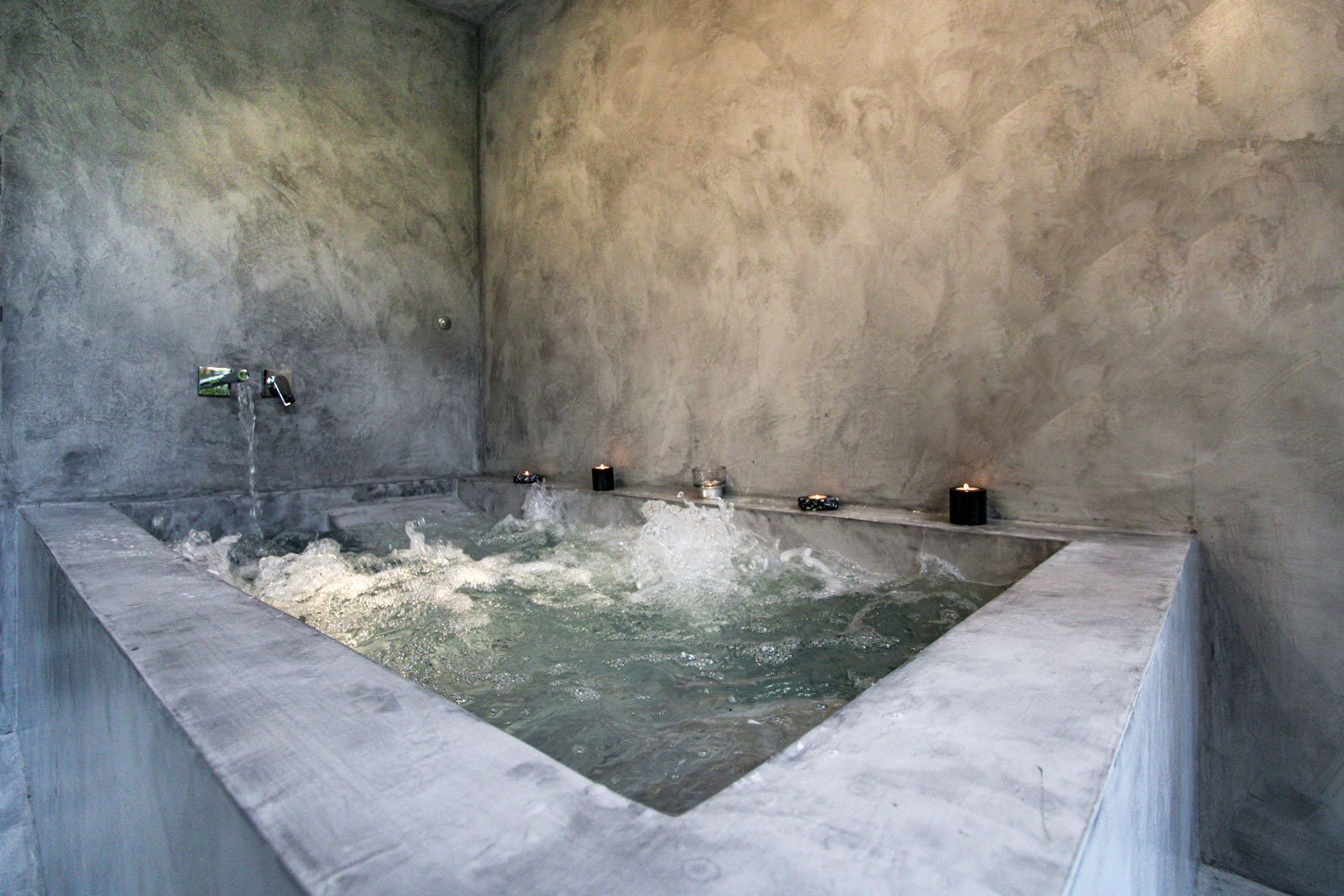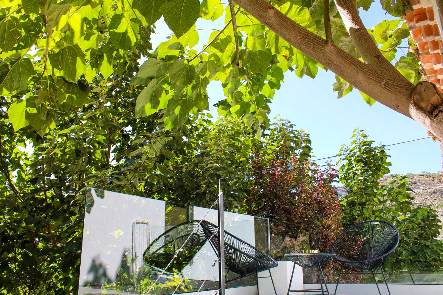 Grotta cuenta con 3 terrazas privadas, a distintos niveles, en la cual en la primera nos encontramos con una mini-piscina privada de exterior (no climatizada), con cromoterapia y cascada de spá, en la segunda ubicada en la parte más alta de la casa rodeada de unas barandillas de cristal, en la cual tu única distracción es ver el cañón del rio Júcar. Y una tercera y amplia terraza, donde los huéspedes podrán comer, cenar, o disfrutar tranquilamente de una copa en nuestra zona chillout.