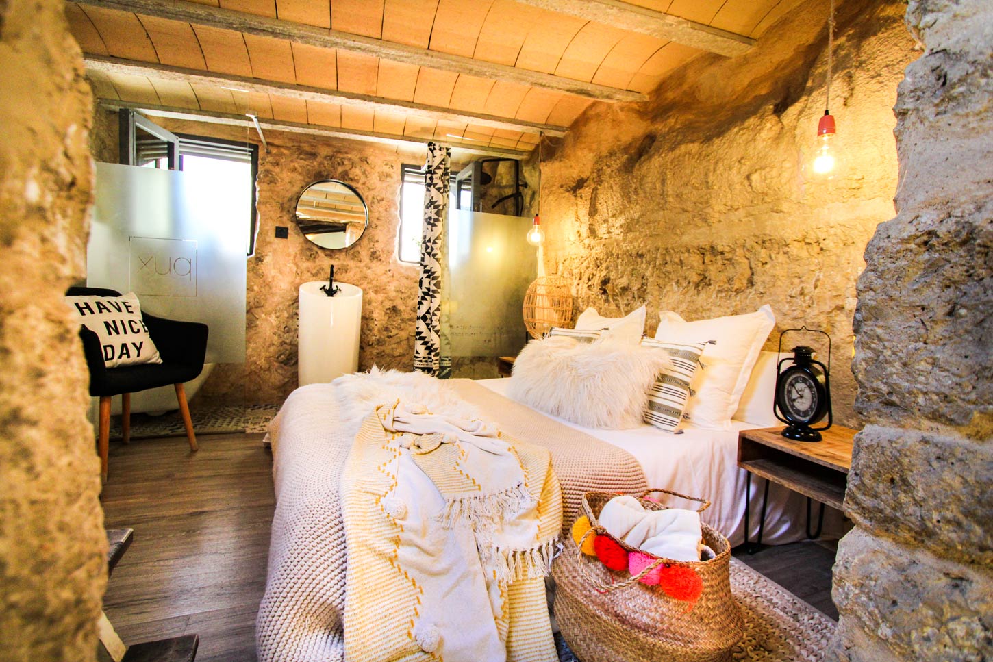 Su dormitorio es peculiar, cuenta con baño en “ensuite” y tras unas escaleras de madera accederás a una terraza privada con barandillas de cristal, donde sus tumbonas pasarán desapercibidas, ya que solo centrarás tu atención en unas espectaculares vistas desde lo más alto de XUQ. Para las épocas de verano, podrá disfrutar de una mini piscina balinesa o jacuzzi de exterior que se encuentra en las zonas comunes del complejo.