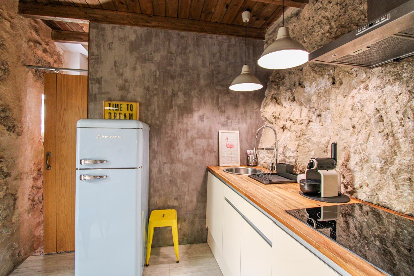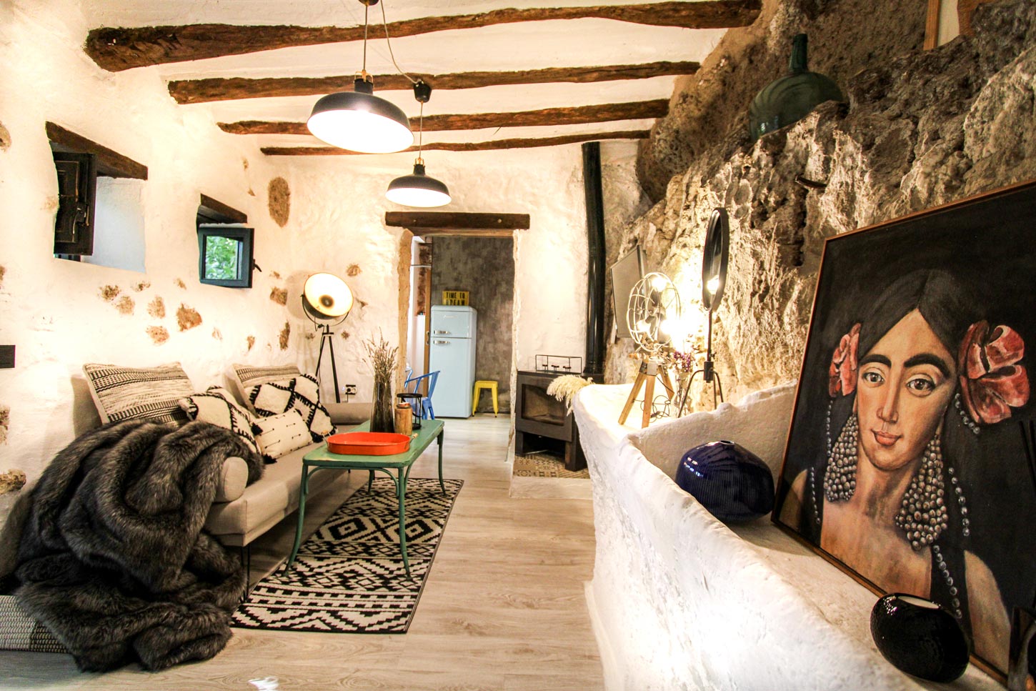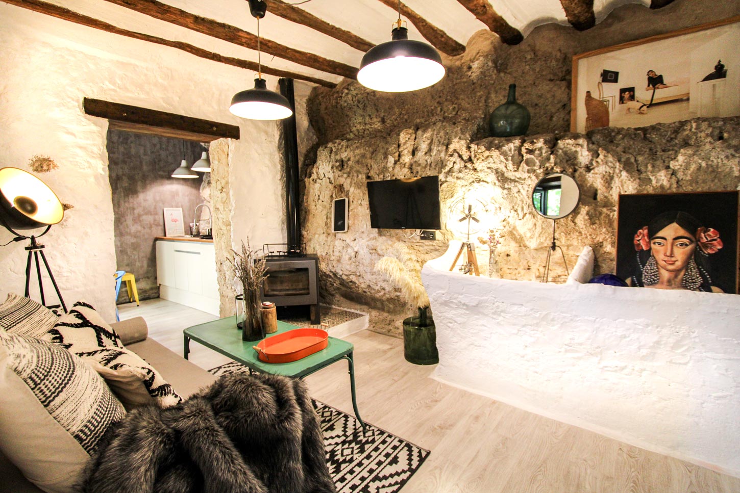 THA es una suite cueva centenaria, que fue rehabilitada íntegramente en 2017, conservando la esencia que le caracterizaba y adaptándola a las nuevas necesidades. Consta de 45 m2, diáfanos y divididos en dos alturas, una planta baja con un salón con chimenea, donde el mobiliario actual convive con los antiguos pesebres donde las caballerizas se alimentaban, dispone de una cocina abierta con una zona de comer. Su peculiar baño cuenta con una ducha arropada por la roca. Su dormitorio está a una doble altura donde se accederá por unos escalones tallados antiguamente en la roca, donde nos encontraremos una cama tatami en un espacio blanco y relajante donde poder desconectar.