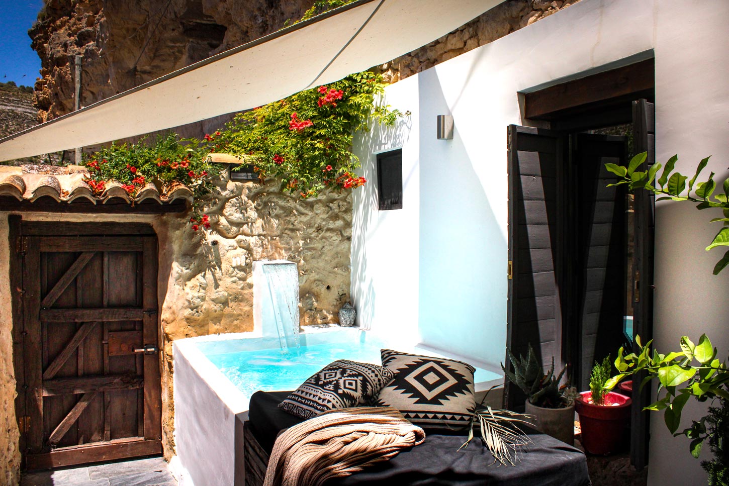 THA cuenta con una terraza privada, con variada vegetación, cuenta con una mini piscina o jacuzzi de exterior privado ( no climatizado), con cromoterapia y cascada de Spá, una amplia barbacoa privada y una zona de descanso con mobiliario.